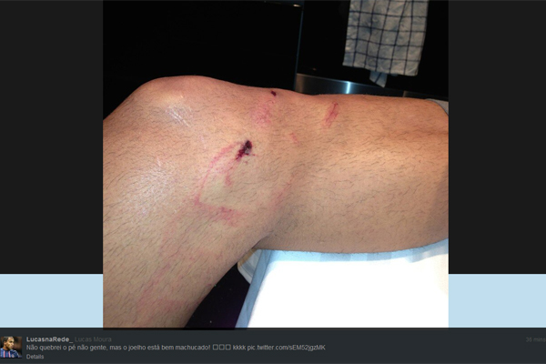 Nesta segunda-feira, Lucas postou em seu Twitter uma foto com um close no seu joelho, visivelmente machucado após o clássico de domingo. Outras marcas de pancadas também podem ser vistas ao longo da perna raspada do jogador.